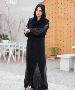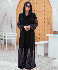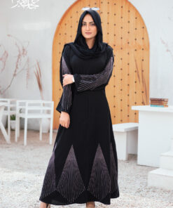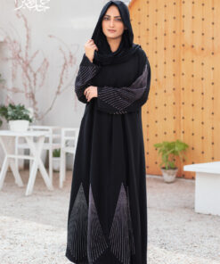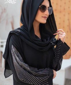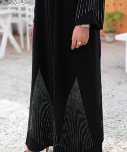 “Adorn yourself in the ‘Starry Night Elegance Abaya.’ Crafted from luxurious nidah fabric, this black masterpiece features enchanting stone work on the sleeves and front. Meticulously stitched with premium craftsmanship, it defines a celestial elegance that transcends time. Step into the night with grace and style.”